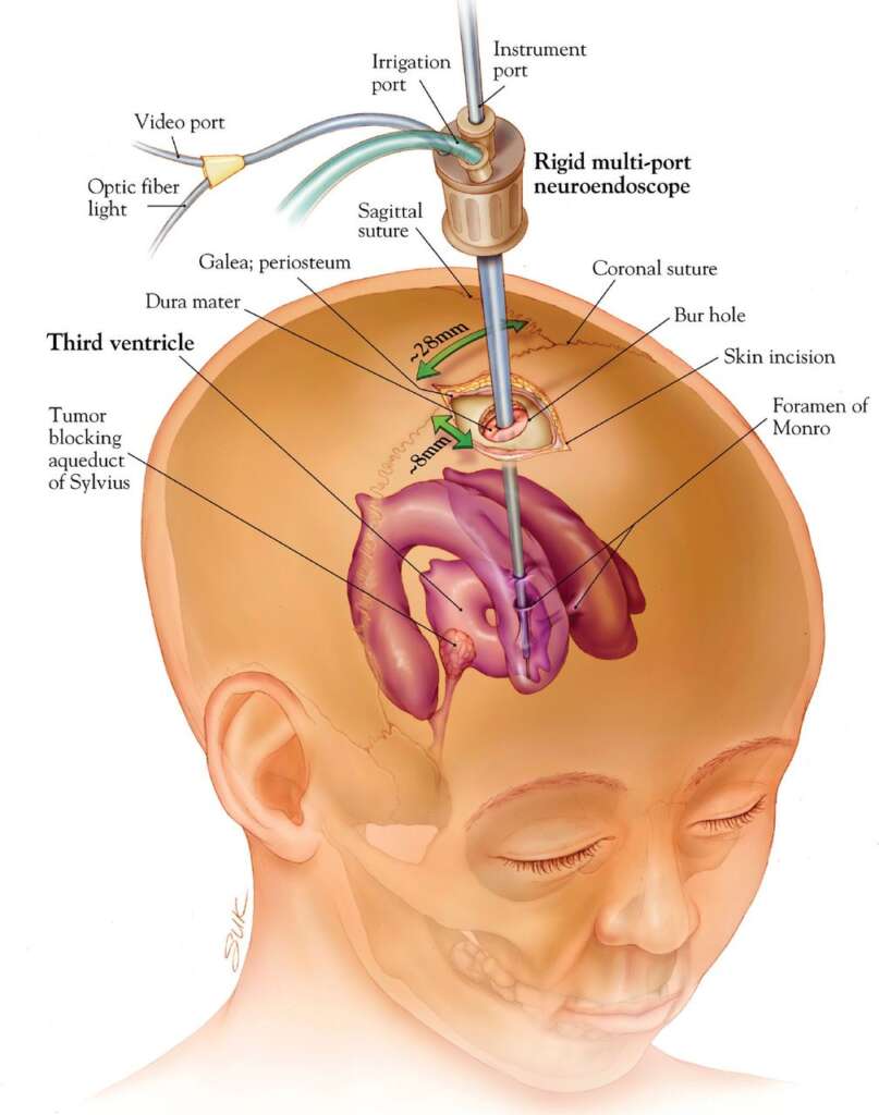 Brain surgery to remove brain tumors can be performed with a minimally invasive technique called a neuroendoscopy. During a neuroendoscopy, your neurosurgeon will access your brain though small (dime-sized) holes in the skull or through the nose or mouth.